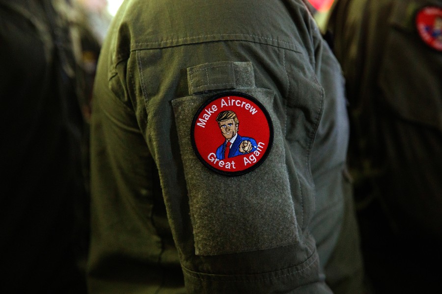 The phrase emblazoned on the patch, along with a likeness of Trump, is a play on his campaign slogan.