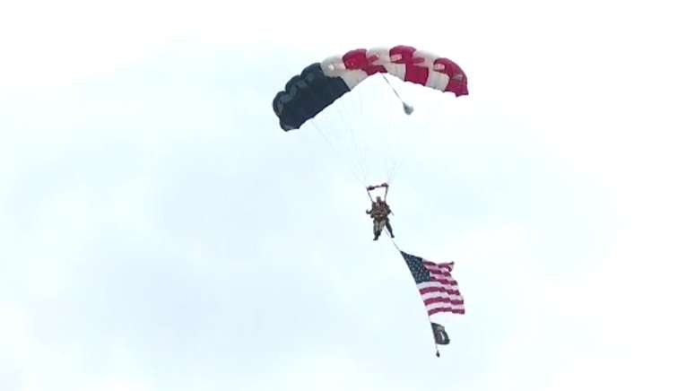 With the throb of their engines rumbling through cloudy skies, C-47 transport planes in World War II colors dropped jumpers with round canopies reminiscent of those used by airborne forces in 1944.