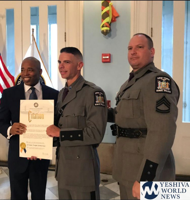 Boro President Eric Adams honored Tuli Abraham and NY State Trooper Joshua Kaye in a ceremony at Boro Hall on Wednesday.