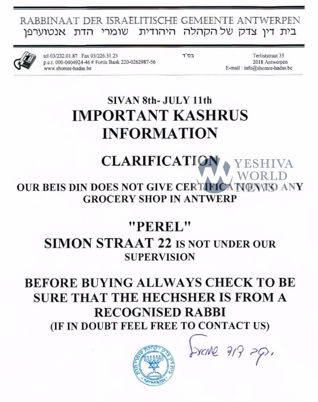 Rabbi Yaakov Dovid Schmahel, Dayan of the Shomeri Hadas community of Antwerp was one of the signers on the letter, as were the Rabbonim of the Sephardic community in the city.