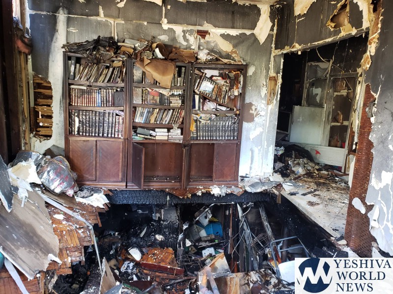 Miraculously, despite the entire home being destroyed, one area was saved – an entire wall of Seforim. See the attached video and photos provided to YWN courtesy of Zion Shmuel of S & S Demolition. Notice the entire beam that is supporting the wall is burned to a crisp, yet the entire bookace holding the weight of all the Seforim miraculously did not collapse and survived the blaze.