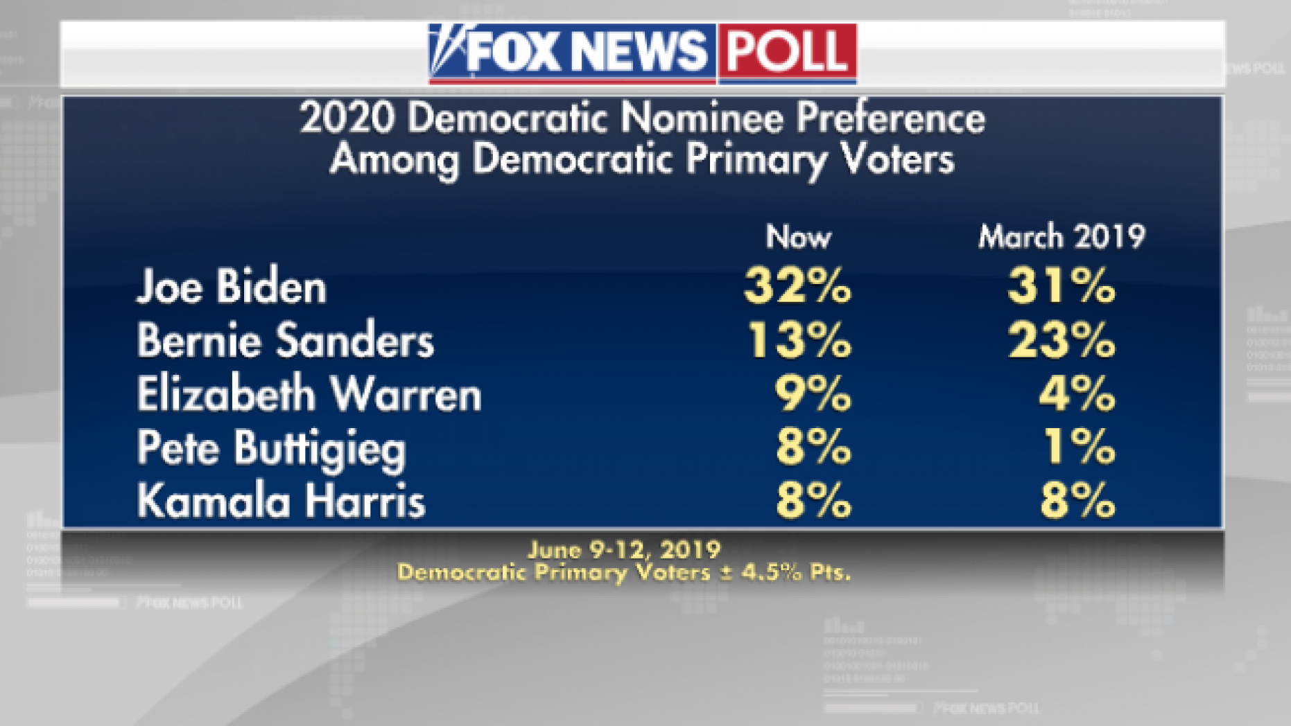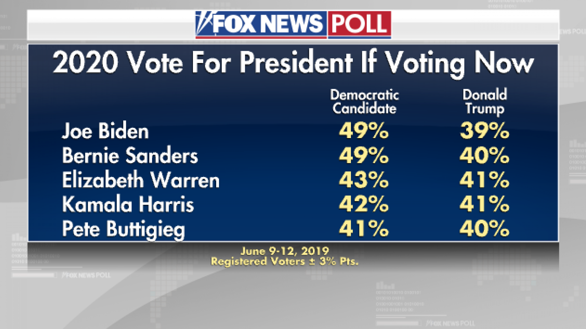 Conducted June 9-12, 2019 under the joint direction of Beacon Research (D) and Shaw & Company (R), this Fox News Poll includes interviews with 1,001 randomly chosen registered voters nationwide who spoke with live interviewers on both landlines and cellphones. The poll has a margin of sampling error of plus or minus three percentage points for all registered voters, and 4.5 points for Democratic primary voters (449).