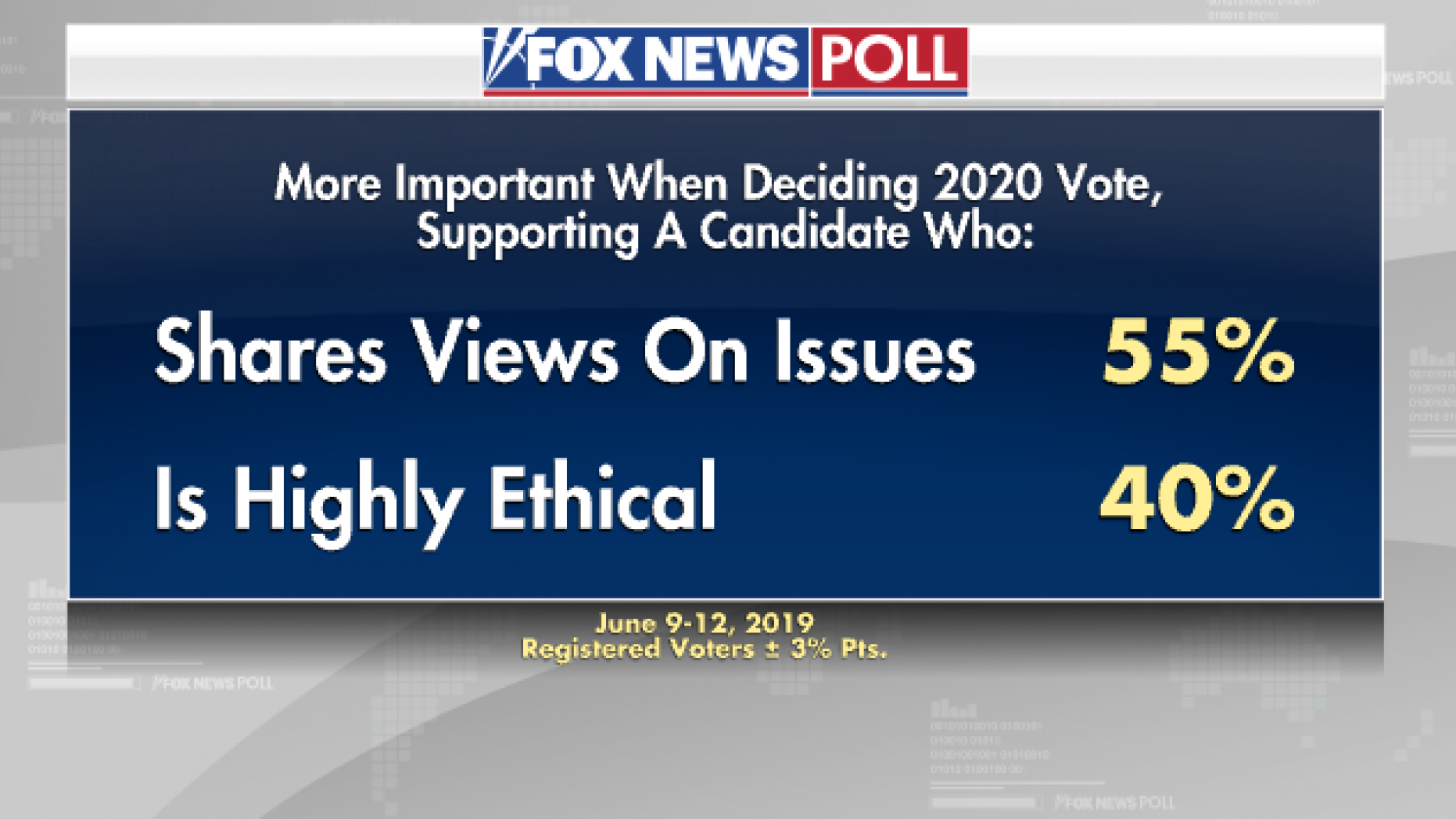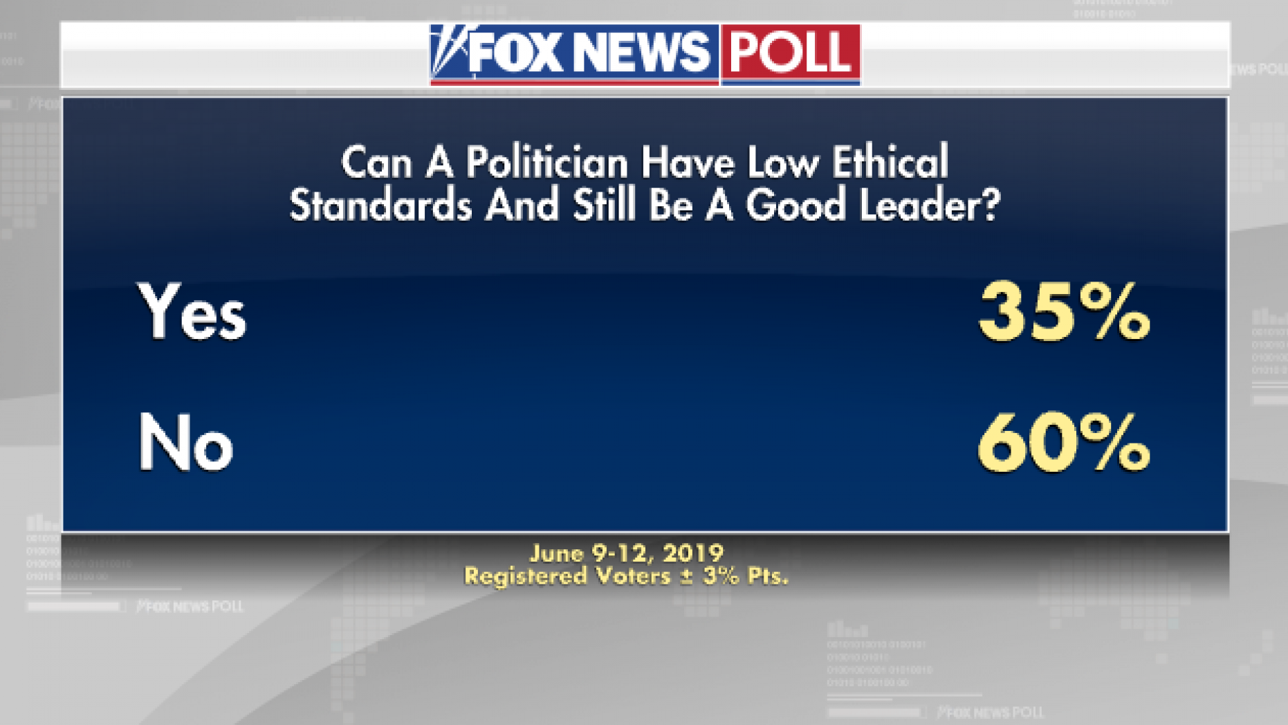 A 60 percent majority doesn’t think a politician with low moral standards can be a good leader, yet voters say they will place greater importance on supporting a candidate who shares their views (55 percent) than one who is highly ethical (40 percent).