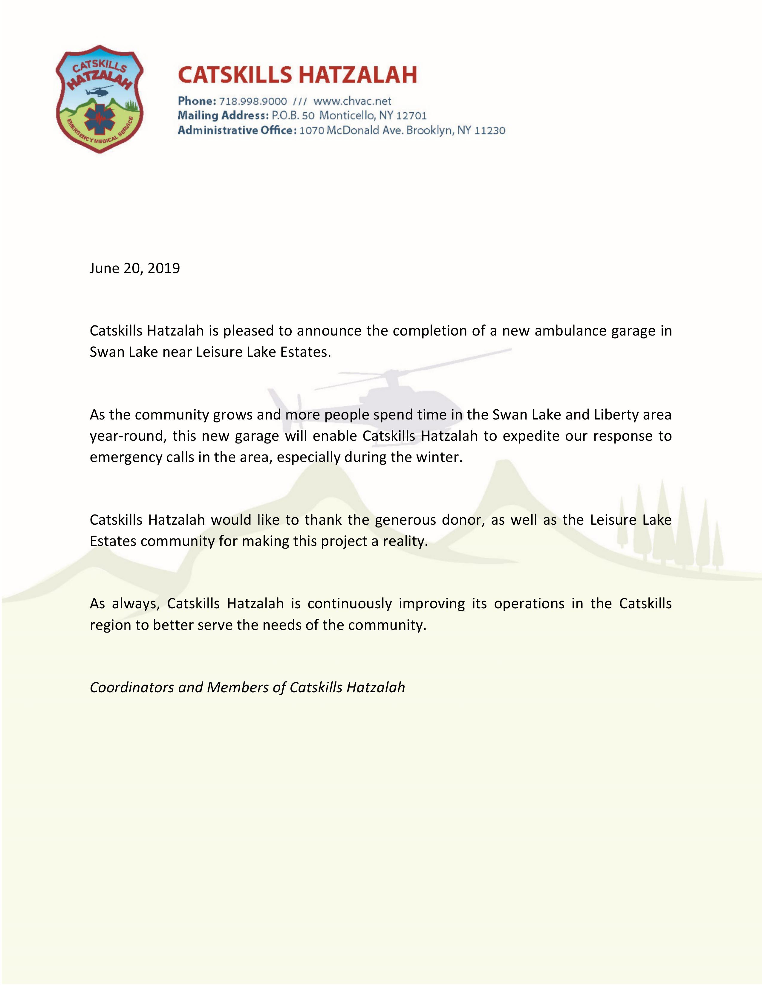 Catskills Hatzalah would like to thank the generous donor, as well as the Leisure Lake Estates community for making this project a reality.