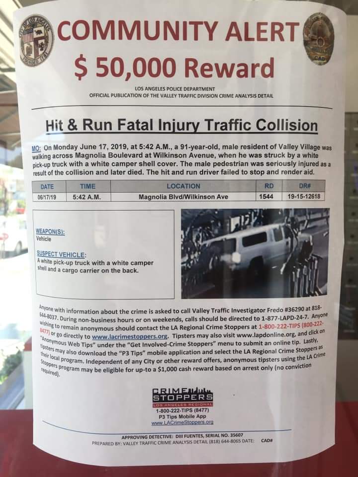 Los Angeles Police Department Valley Traffic Division detectives are now trying to track down a truck and are asking the public’s help in finding it. It’s a white Toyota Tundra-type truck with a camper shell.