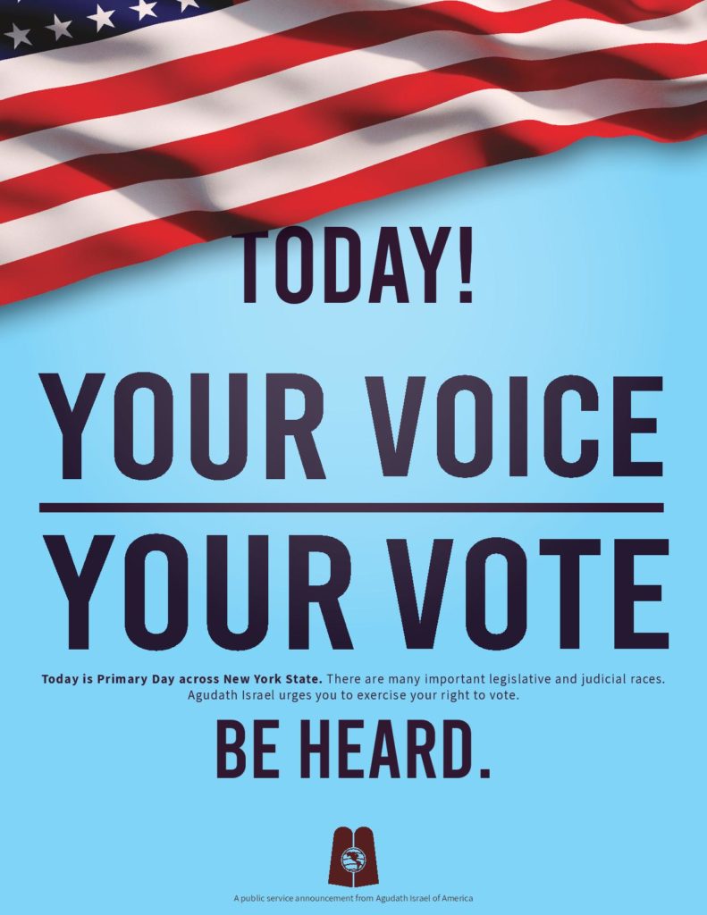 This Tuesday, June 25th, is Primary Election Day across New York State. Voters throughout the state will be selecting the party nominees for many offices, including Districts Attorney in Queens and Rockland County, as well as some important judicial and legislative elections. Agudath Israel urges all in our community to exercise this most important right and vote.