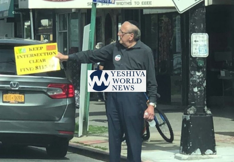 He is doing nothing more than standing in a dangerous spot holding a small sign. There is a much larger sign at the intersection which reads KEEP INTERSECTION CLEAR. Everyone who travels that road knows that stopping in the intersection is an offence. As for Rebbitzen Goldenpickanicerscreenname