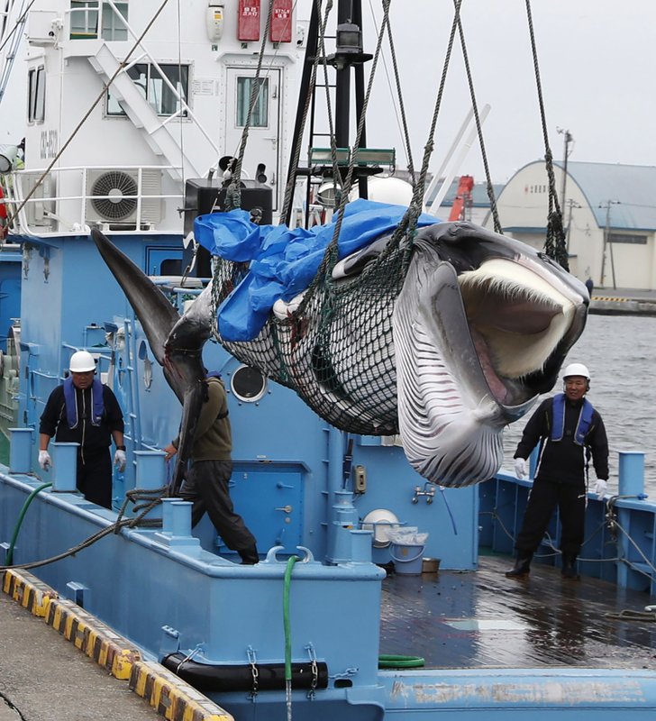 A fleet of five boats left the northern Japanese port of Kushiro earlier Monday and brought back two minke whales. A crane lifted them and slowly placed them on the back of a truck to be taken to a portside factory for processing. Workers in blue plastic overalls poured sake from paper cups onto the first whale to express thanks and celebrate the first catch.