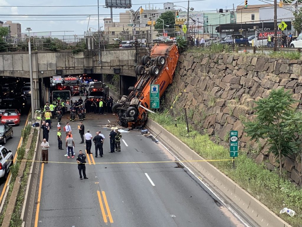 #Video right after this #UnionCity #DPW #Truck careened over the Palisade Ave overpass onto 495. You can see drivers go to check on driver from cars stopped. Luckily only debris hit two other vehicles and no fatalities. #1010WINS pic.twitter.com/U7yT9jR7qM