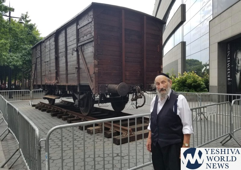 An elderly Holocaust survivor delivered a short but moving few words while standing in front of the vintage German train car – currently on display in NYC – used to transport men, women and children to Auschwitz and other Nazi death camps.