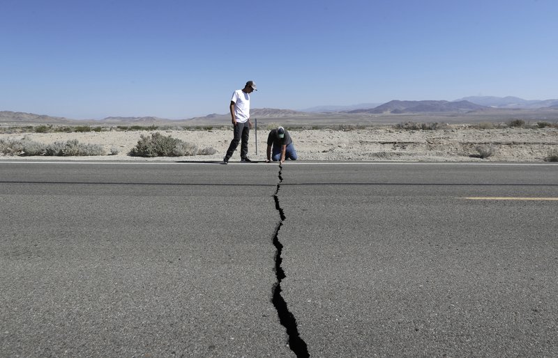 Ron Mikulaco, 51, and his nephew, 23-year-old Brad Fernandez, stood on 178 on Saturday looking at the cracks. The pair drove from Huntington Beach, about 170 miles (274 kilometers) southwest of Ridgecrest. Mikulaco, an amateur geologist, wanted to show his nephew “the power of Mother Nature,” and they had the epicenter’s latitude and longitude coordinates ready.