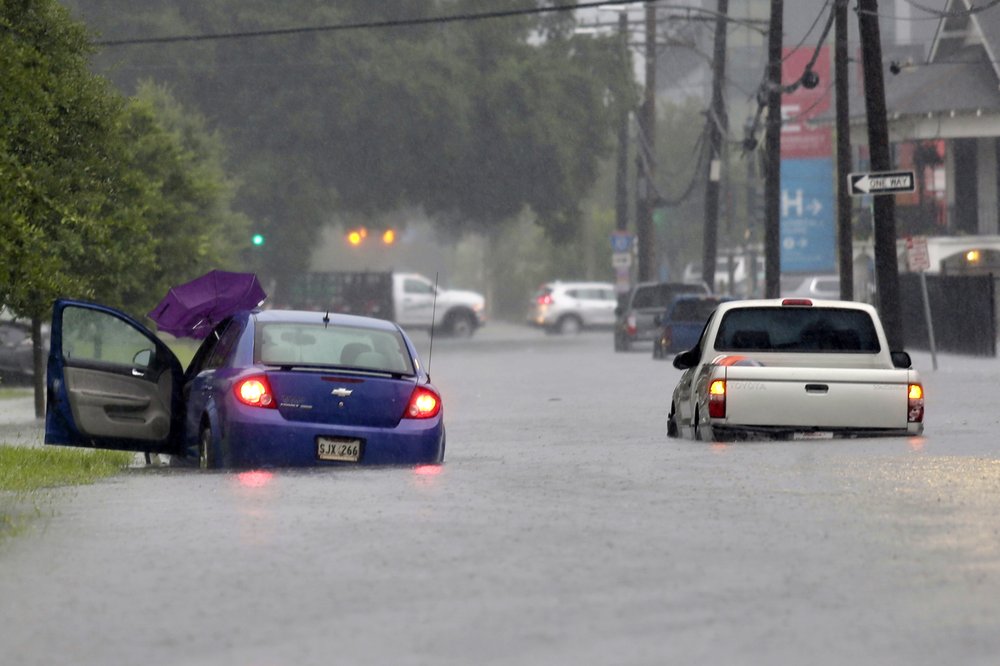 Vehicles are stuck in floodwaters along S. Galvez Street as heavy rain falls, Wednesday, July 10, 2019, in New Orleans. (David Grunfeld/The Advocate via AP)