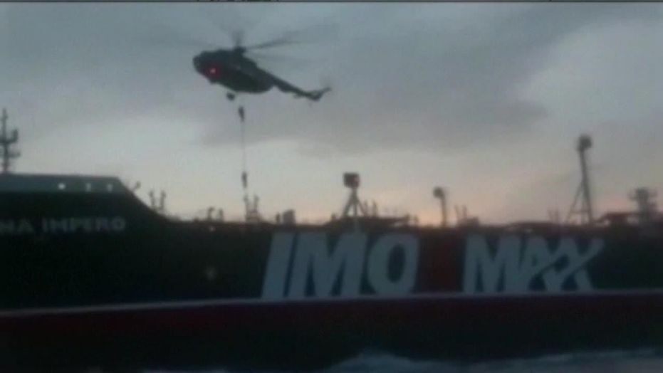 In a dramatic video released by the Revolutionary Guard, several small Guard boats can be seen surrounding the larger tanker as it moves through the strait. Above, a military helicopter hovers and then several men wearing black masks begin to rappel onto the ship.