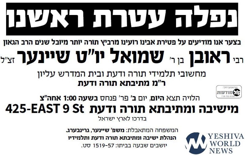 The Levaya will be held at 1:00PM at the Yeshiva, located at 425 East 9th Street in Brooklyn.