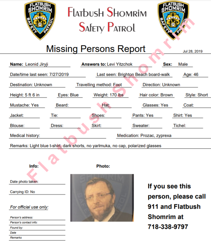 Missing is a 46-year-old male, named Leonid Jiryji – who answers to “Levi Yitzchok”. He is 5 foot 6 inches, blue eyes, short brown hair, a mustache, and weighs approximately 170 pounds. He wears glasses.