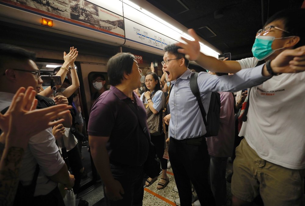 AP video showed heated exchanges at Tiu Keng Leng station, where a crowd of protesters and commuters filled the platform and a stopped train.