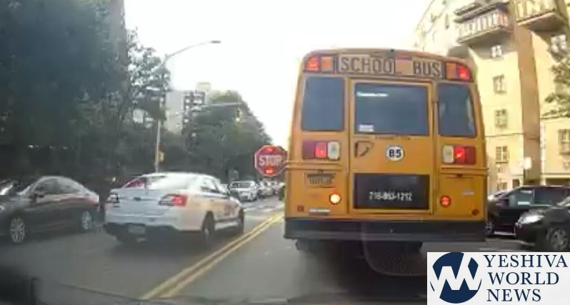 This video, published first by @NYScanner on Monday morning shows an NYPD vehicle passing a school bus on a Williamsburg, Brooklyn street.