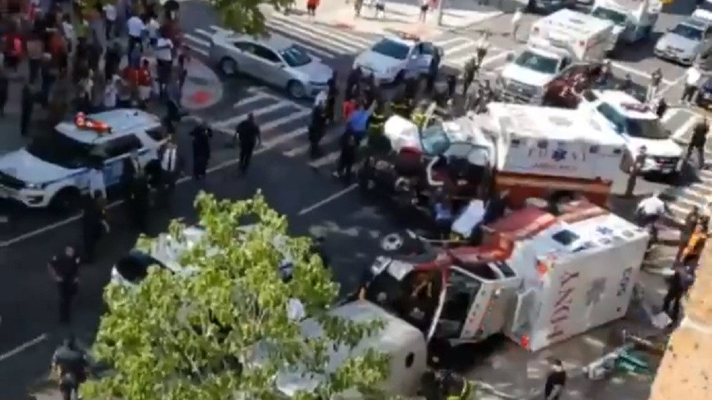 Fire department officials say four emergency workers were injured and needed medical attention Saturday afternoon when one of the ambulances plowed into the other at an intersection in the Mott Haven neighborhood. The impact overturned the second ambulance, trapping two EMS workers.
