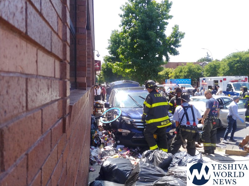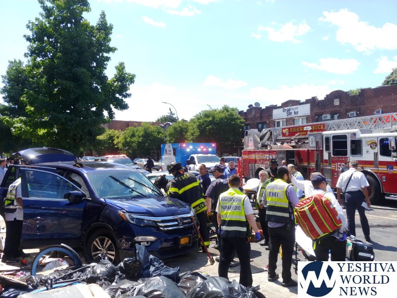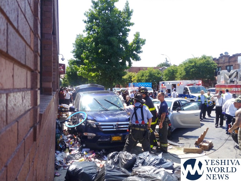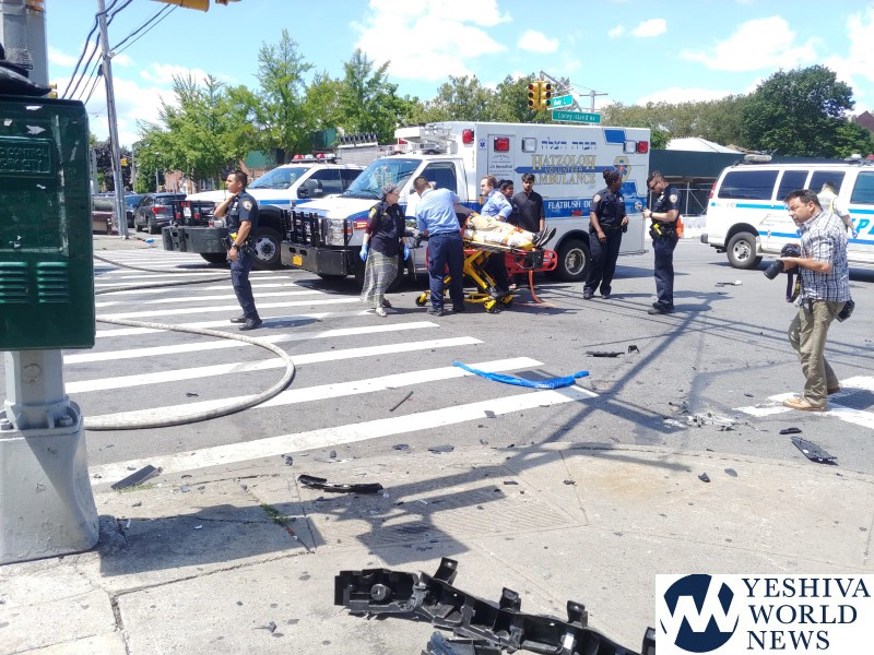 It happened just before 12:30 at the intersection of Avenue L and Coney Island Avenue, when two cars collided. One of the vehicle jumped the curb, and slammed into a bicyclist, who was pinned against the Vertzky Yeshiva building.