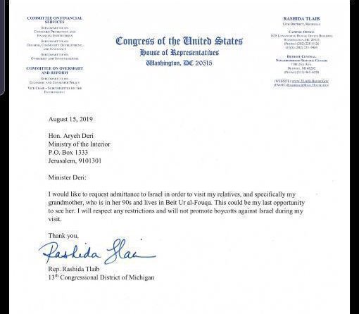 In her letter, Tlaib said this would likely be the last chance to see her grandmother and that she would respect any restrictions and “not promote boycotts” during her visit.