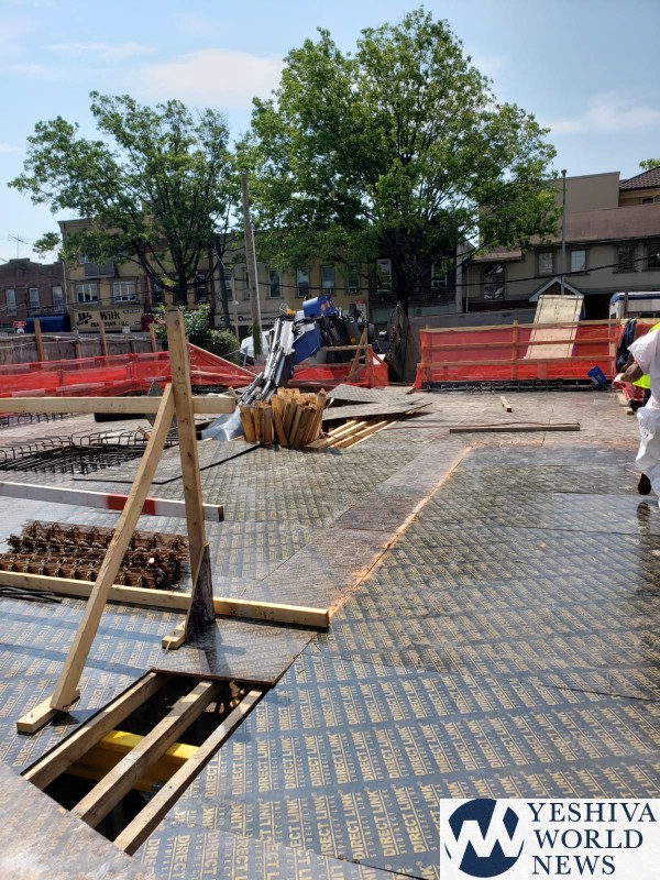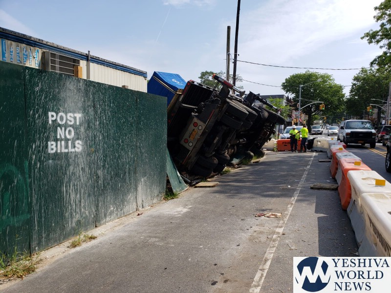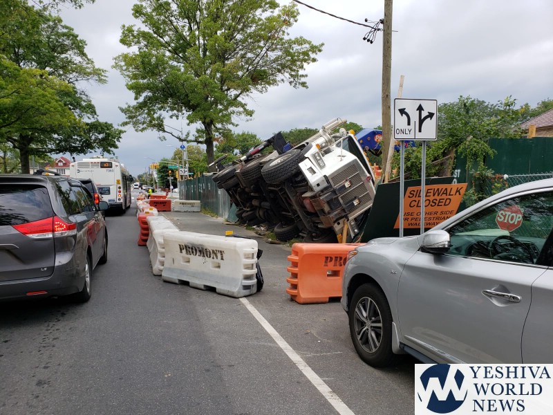 A boom truck delivering equipment to a construction site in Flatbush overturned on Wednesday morning.