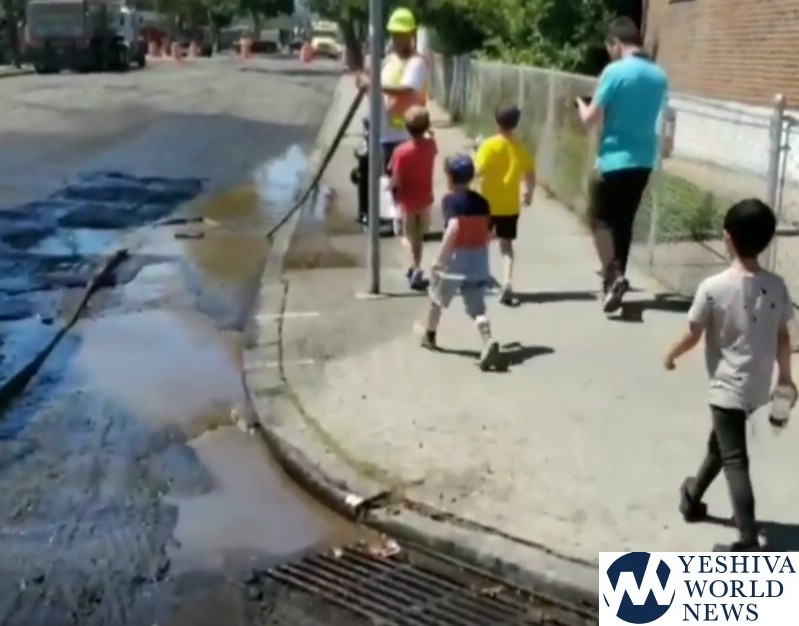 During this past weeks hot weather, the junior boys of Ruach day camp in Flatbush – together with the assistant head counselor Yitzy Litvintchouk were giving out cold water bottles to the workers repairing the road in front of camp.
