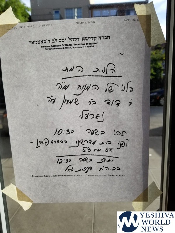 The Levaya will be at 10:30AM at the Satmar Beis Medrash on 53 St, and Kevura in Kiryas Joel.