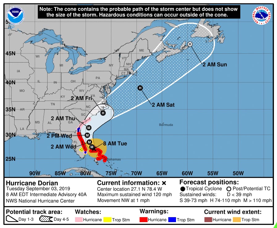 Forecasters said that the storm had come to a near standstill because the steering currents in the atmosphere had collapsed, but that Dorian would resume moving later in the day, getting “dangerously close” to the Florida coast through Wednesday evening, very near the Georgia and South Carolina coasts Wednesday night and Thursday, and near or over the North Carolina shoreline late Thursday.