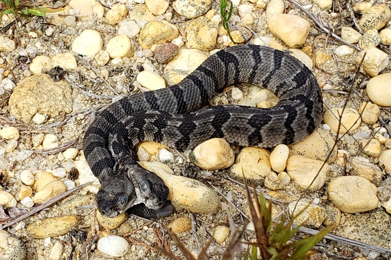 A newborn two-headed timber rattlesnake has been found in New Jersey’s Pine Barrens. Herpetological Associates of Burlington County CEO Bob Zappalorti says the snake has two brains and each head acts independently of the other.