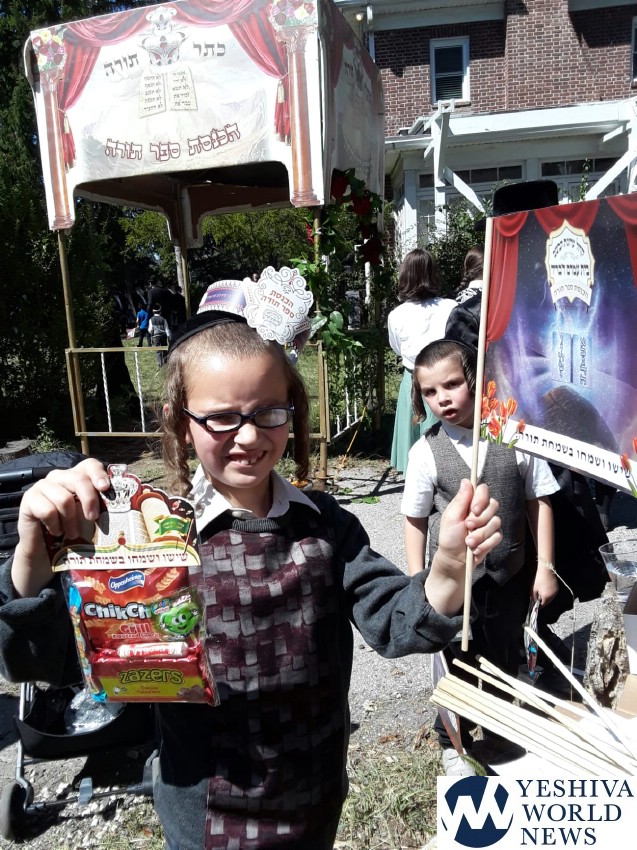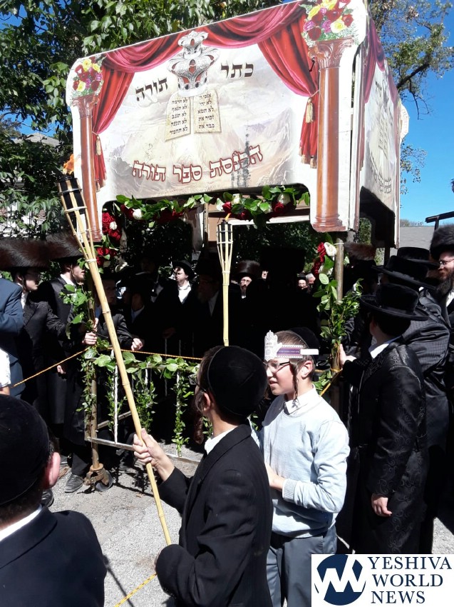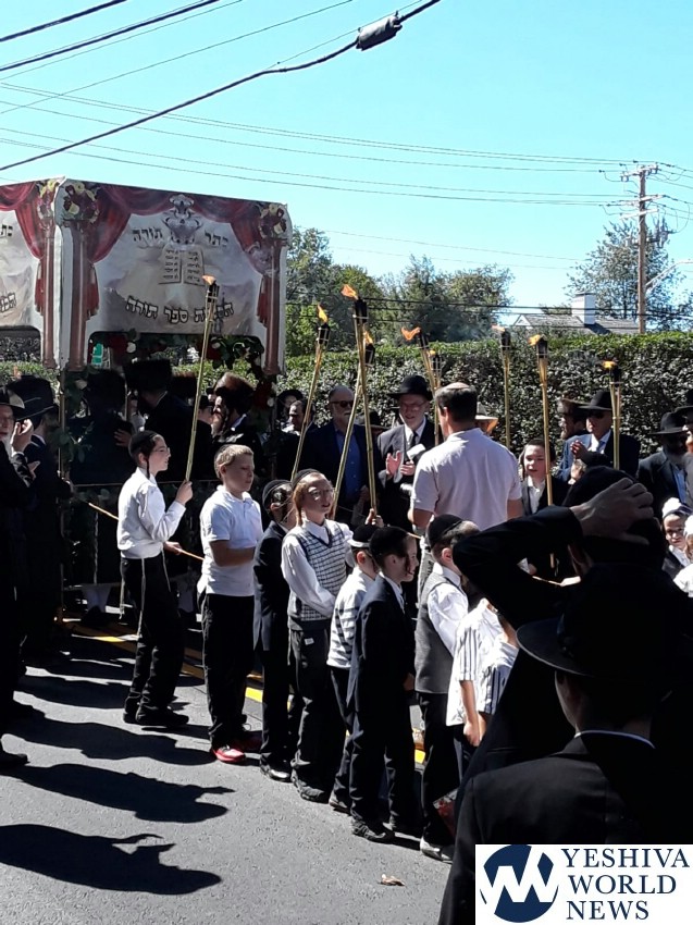 Taubs’ front lawn and watched the Taub grandchildren distribute pekelach filled with candy, flags, and headbands to children. When the torches were lit, and Park Heights Avenue and Clark’s Lane were blocked off for the procession route, we knew the writing had been completed. The Brider Rebbe, Rabbi Shaye Taub, proudly came out of his house hugging the new sefer Torah which was regally dressed in gold embroidered blue velvet, topped with red roses.