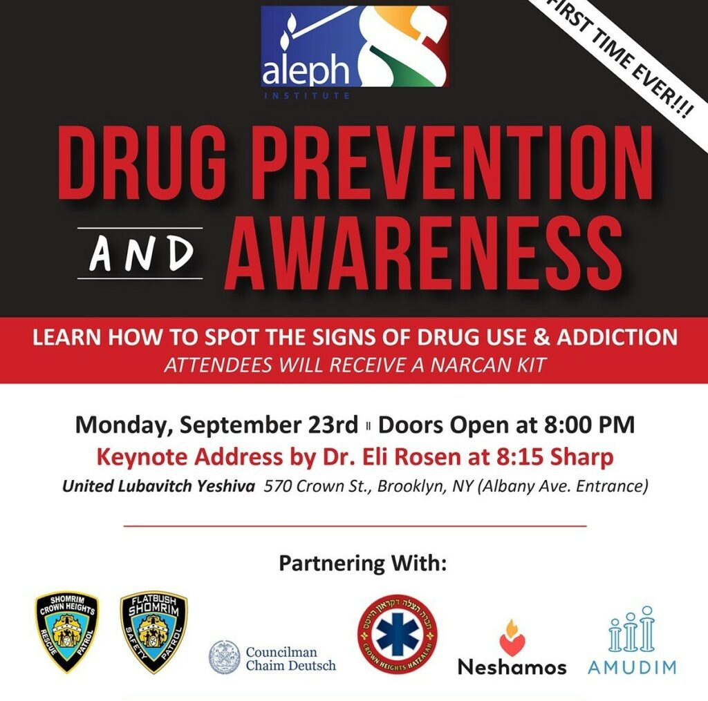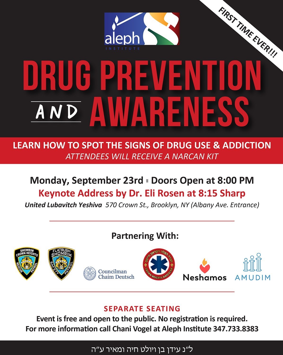 For the first time ever! Aleph Institute is proud to present an evening highlighting drug prevention and awareness. Together with the Neshamos organization, and Dr. Rosen, they have partnered to spread awareness about the epidemic plaguing all of us.