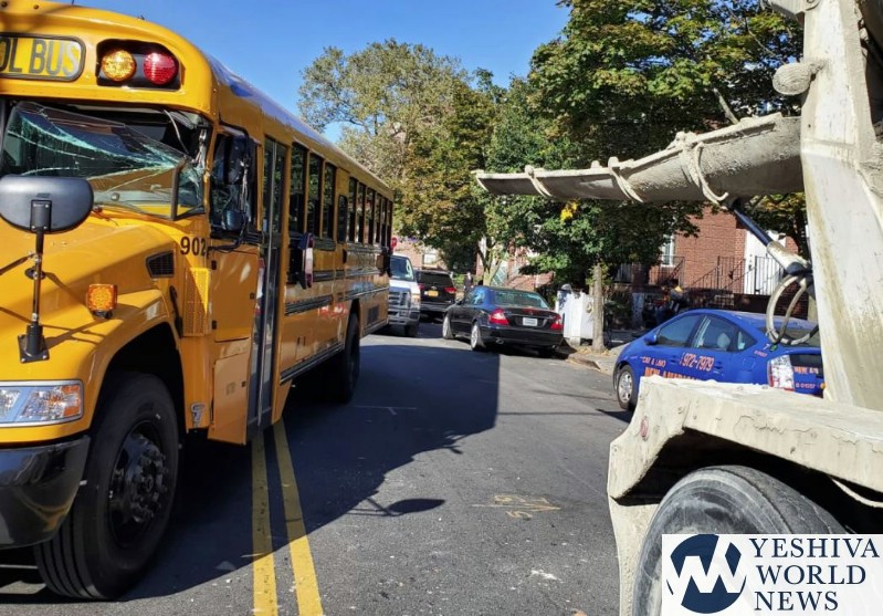 A school bus carrying children to Yeshiva collided with a cement truck in Flatbush, Tuesday morning, and Bichasdei Hashem, no one was injured.