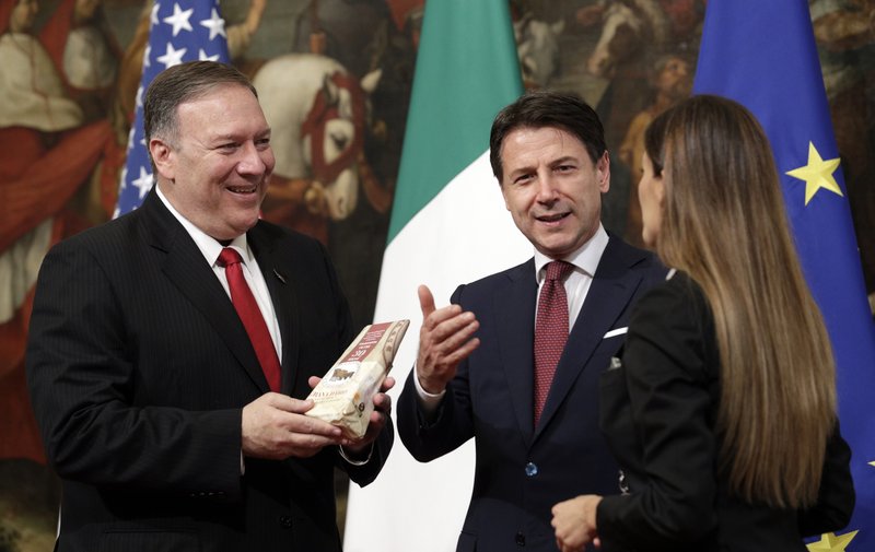 U.S. Secretary of State, Mike Pompeo, left, holds a package of parmesan cheese he was given by a journalist as Italian Premier Giuseppe Conte stands beside him, following their meeting at Chigi Palace premier's office in Rome, Tuesday, Oct. 1, 2019. 2019. U.S. Secretary of State Mike Pompeo is in Italy at the start of a four-nation tour of Europe as the push to impeach President Donald Trump gains steam at home. (AP Photo/Andrew Medichini)