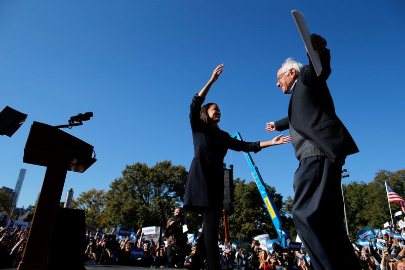 Democratic presidential candidate Sen. Bernie Sanders, I-Vt., hugs Rep. Alexandria Ocasio-Cortez, D-N.Y. during a campaign rally on Saturday, Oct. 19, 2019 in New York. (AP Photo/Eduardo Munoz Alvarez)