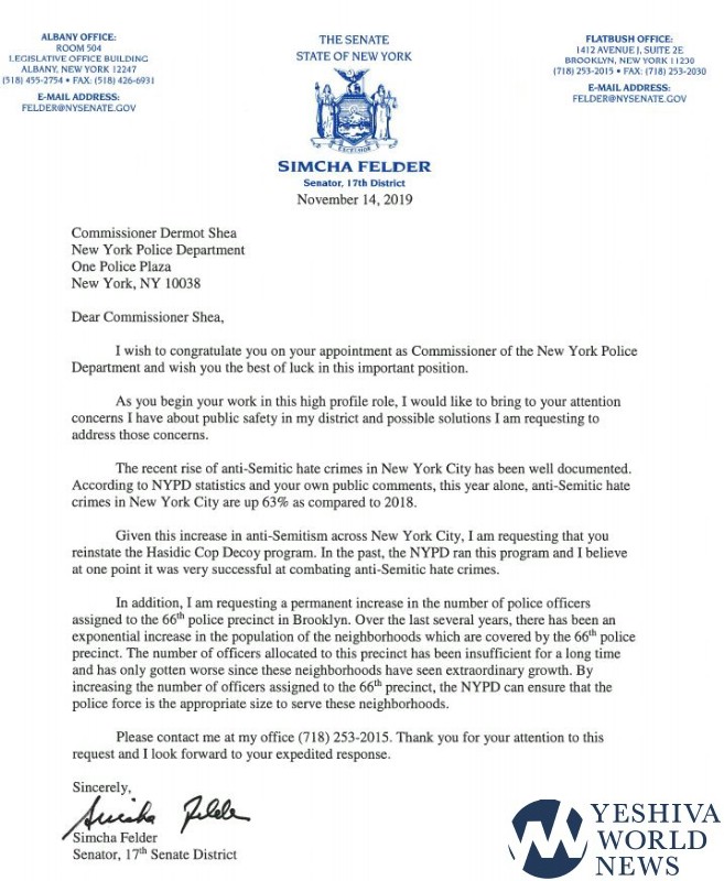 Given the increase in anti-Semitism across New York City, Senator Simcha Felder wrote to incoming NYPD Commissioner Dermont Shea to wish him luck in his new position and bring to his attention the concerns he has about public safety in his district and possible solutions he is requesting to address those concerns.