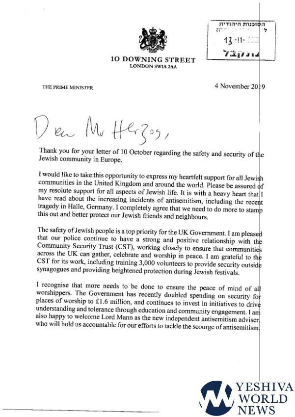 The British Prime Minister’s letter was sent around a month after the attempted massacre of Jewish worshipers at a shul in the city of Halle, Germany during Yom Kippur. After the incident in Halle, Herzog sent an urgent letter to some 30 European leaders demanding that they increase security at Jewish institutions within their countries and act out against all manifestations of anti-Semitism.