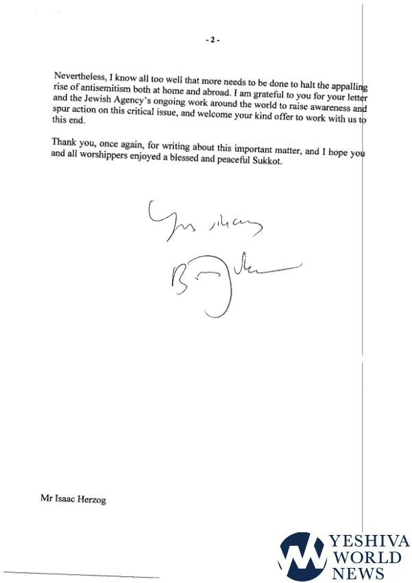Johnson concluded his letter by accepting Herzog’s proposal for cooperation between The Jewish Agency and the British Government in the fight against anti-Semitism: “I am grateful to you for your letter and The Jewish Agency’s ongoing work around the world to raise awareness and spur action on this crucial issue, and welcome your kind offer to work with us to this end.