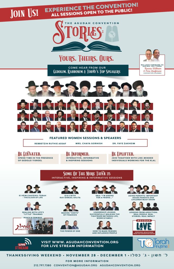 There are not many places where one can expect to meet Gedolim while waiting for the elevator, or hear from askonim about their plans for dealing with Klal Yisroel’s challenges. But at the Agudah Convention that will happen, as we share what is perhaps the greatest story of all time: The story of the Jewish people.