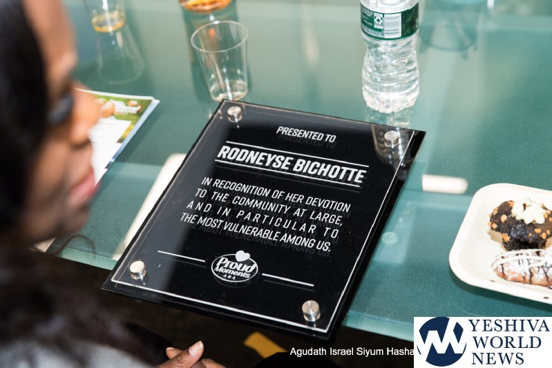 Speaking at Proud Moments’ Boro Park offices, Agudah board of trustees’ member Chaskel Bennett, described Proud Moments as the “best of the best,” and thanked the Rubin and Goldfeder families for their partnership in The Siyum. Agudah Executive Vice President Rabbi Chaim Dovid Zwiebel lauded Proud Moments as a role model for other community businesses and described the Siyum HaShas as a bridge that unites Klal Yisroel in every corner of the world and from all backgrounds. That theme was echoed in Rabbi Zwiebel’s remarks praising New York State Assemblywoman Rodneyse Bichotte, a member of the Assembly’s health committee, who has spent her time in office building bridges between communities, who was awarded a plaque in recognition of her exemplary devotion to the community and its special needs children by Proud Moments CEO Eli Rubin. Accepting the award, Assemblywoman Bichotte spoke briefly about the common bond shared by people of faith who raise their children with similar values, noting that those principles are actually Torah based.