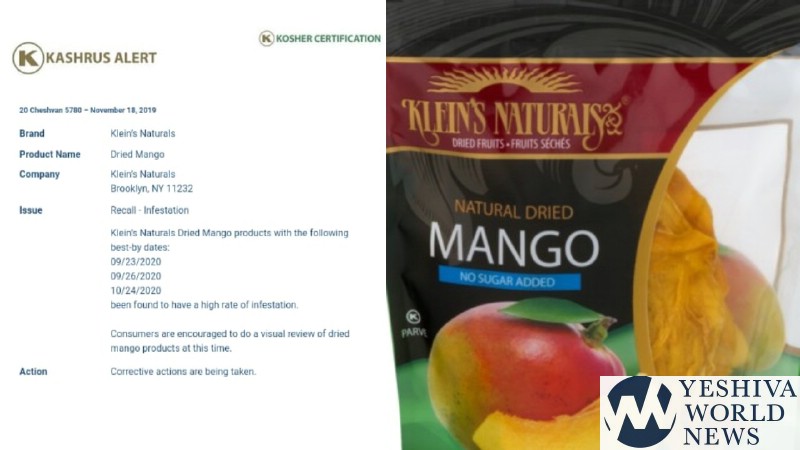 The OK Kashrus Agency has released an alert regarding bugs found in “Klein’s Dried Mango”.