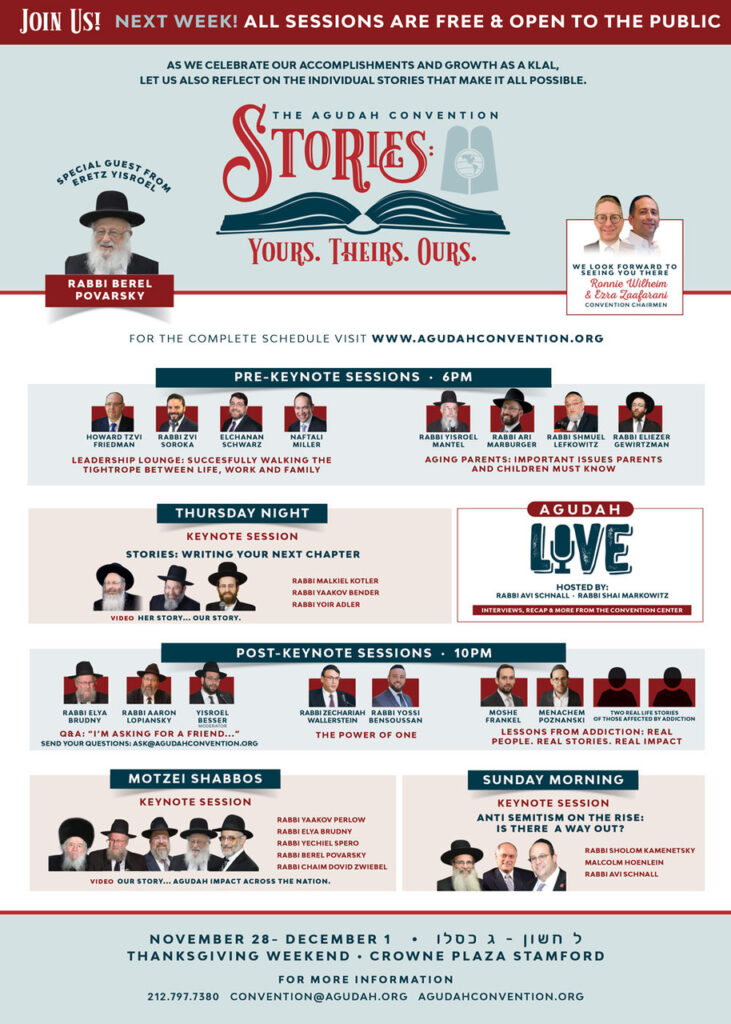 This year’s Agudah Convention, to be held lamed Cheshvan through gimmel Kisleiv, November 28th through December 1st, at the Crowne Plaza Stamford, will give people a chance to share those stories, telling and listening to the stories that guide our existence as am Yisroel.