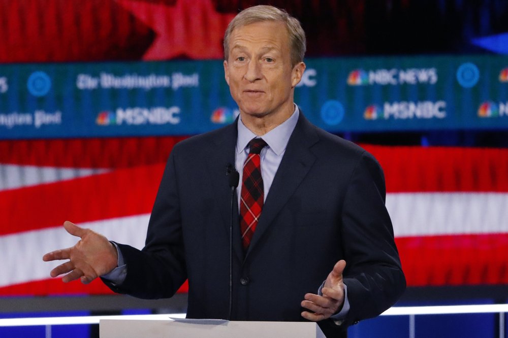In this Nov. 20, 2019, file photo, Democratic presidential candidate investor Tom Steyer speaks during a Democratic presidential primary debate in Atlanta. Democrats are narrowing Donald Trump's early spending advantage, with two billionaire White House hopefuls joining established party groups to target the president in key battleground states that are likely to determine the outcome of next year's election. (AP Photo/John Bazemore, File)