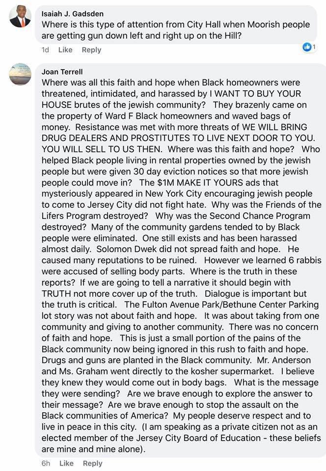 The mourning period is over. It’s time to get back to the issues of great importance, and Jew hating seems to be the top of the list for Jersey City Board of Education Trustee Joan Terrell.