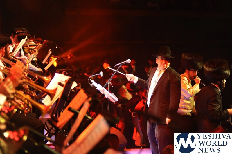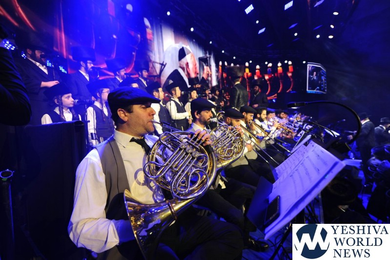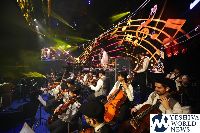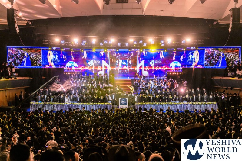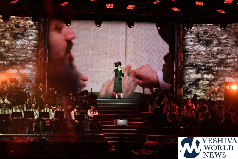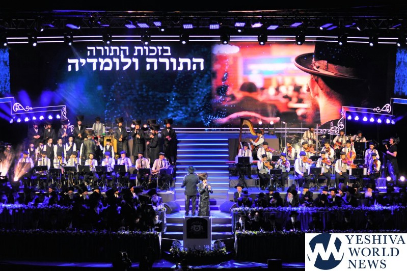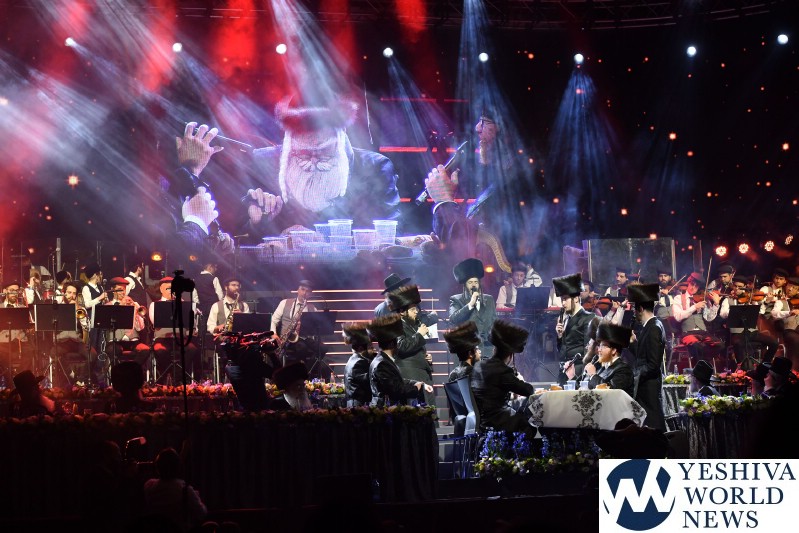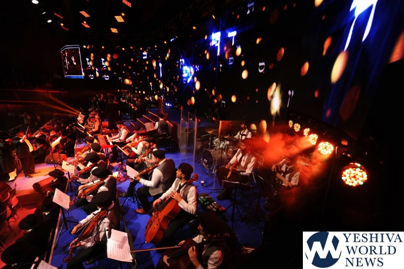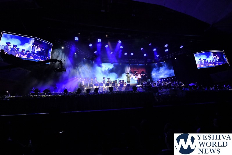 The screen was studded with stars, tall orange candles flickered gently and a giant picture of Rav Aharon Leib Shteinman focused on a sefer – held a place of honor high above the stage. The entire area was bathed in a sea of warm blue light – truly regal fashion benefitting the occasion, it was as if the crowd had just stepped into a royal Torah celebration they would never forget – an auditorium transformed into an incredibly beautiful Beis Medresh for the night. In a beautiful detail reminiscent of Dovid Hamelech’s midnight learning sessions, a gigantic harp occupied a place of honor near center stage. A few feet down stood the incredibly talented Reb Moshe Mona Rosenblum – musical conductor for the night – his tzitzis flying in time to the beat. Across from the harp stood both an adult and children’s choir, magnificent voices blending in full throated harmony.