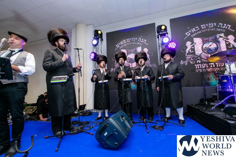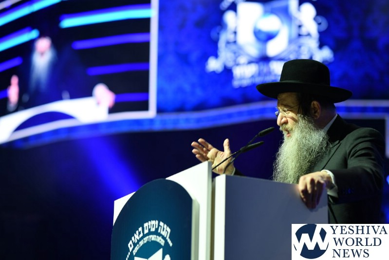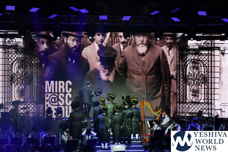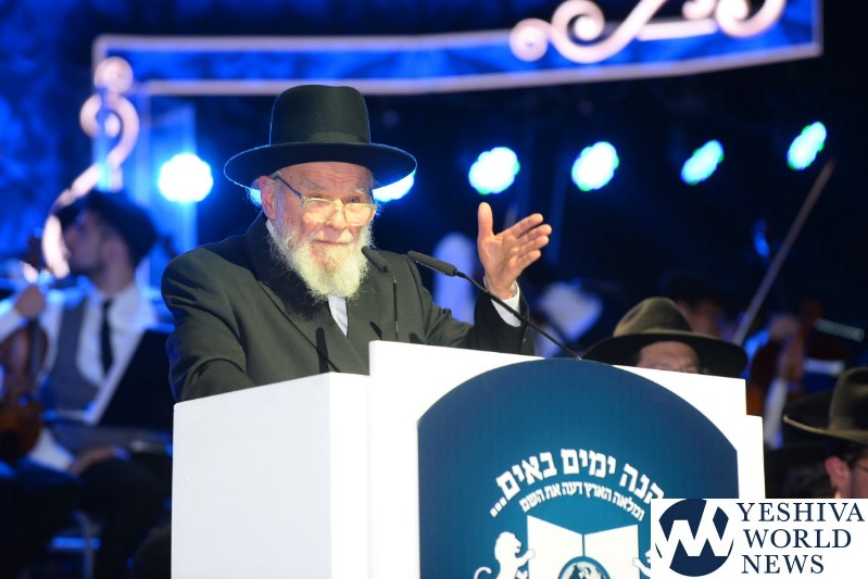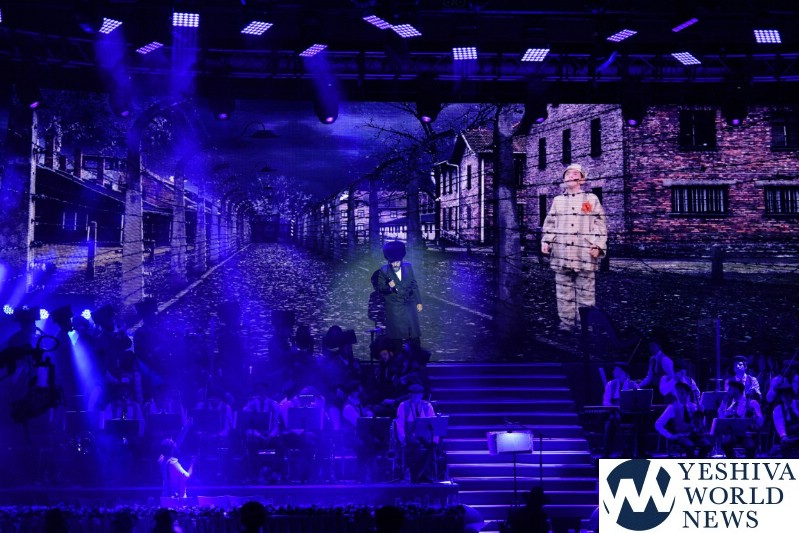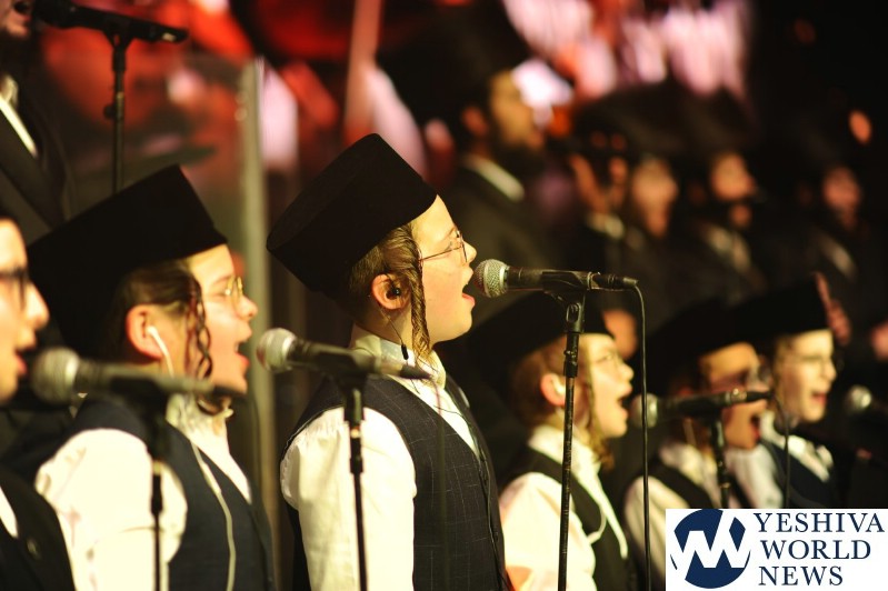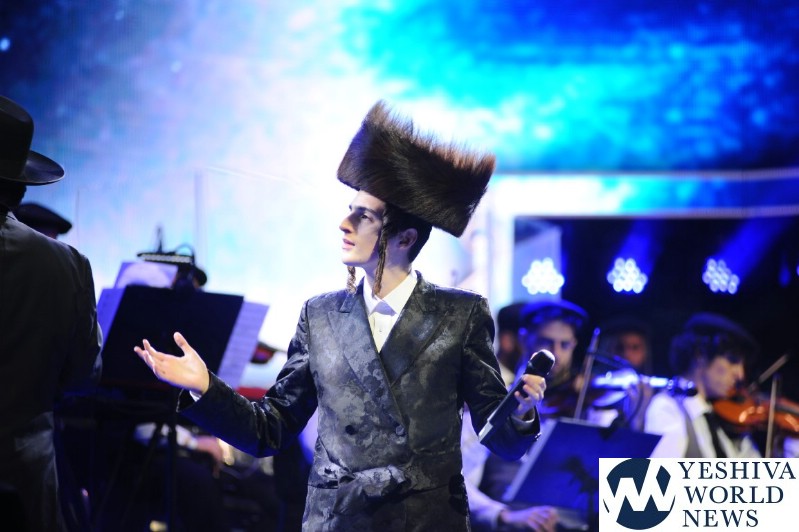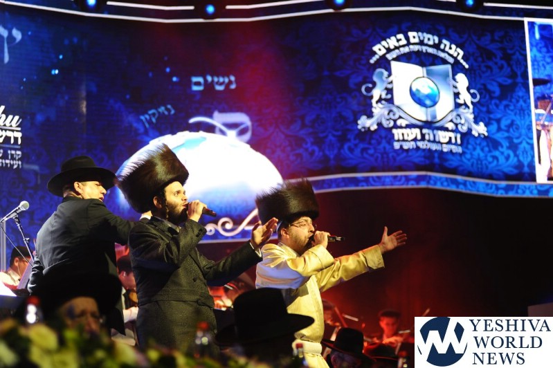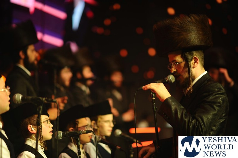 The screen was studded with stars, tall orange candles flickered gently and a giant picture of Rav Aharon Leib Shteinman focused on a sefer – held a place of honor high above the stage. The entire area was bathed in a sea of warm blue light – truly regal fashion benefitting the occasion, it was as if the crowd had just stepped into a royal Torah celebration they would never forget – an auditorium transformed into an incredibly beautiful Beis Medresh for the night. In a beautiful detail reminiscent of Dovid Hamelech’s midnight learning sessions, a gigantic harp occupied a place of honor near center stage. A few feet down stood the incredibly talented Reb Moshe Mona Rosenblum – musical conductor for the night – his tzitzis flying in time to the beat. Across from the harp stood both an adult and children’s choir, magnificent voices blending in full throated harmony.