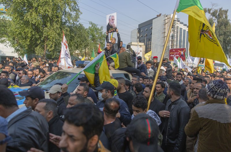 Mourners march during the funeral of Iran's top general Qassem Soleimani, 62, Abu Mahdi al-Muhandis, deputy commander of Iran-backed militias in Iraq known as the Popular Mobilization Forces and fellow militant leaders, in Baghdad, Iraq, Saturday, Jan. 4, 2020. Thousands of mourners chanting "America is the Great Satan" marched in a funeral procession Saturday through Baghdad for Iran's top general and Iraqi militant leaders, who were killed in a U.S. airstrike. (AP Photo/Nasser Nasser)
