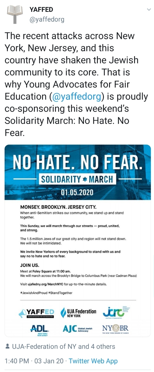 YAFFED as an organization has no place in this show of unity. They are directly responsible for the recent onslaught of negative press against Orthodox Jews, the very type of Jew that is victimized, bullied and the reason for this march. Headline after headline portray the Orthodox Jewish community as illiterate, a cult-like group that abuses their children by not exposing them to a public school curriculum.