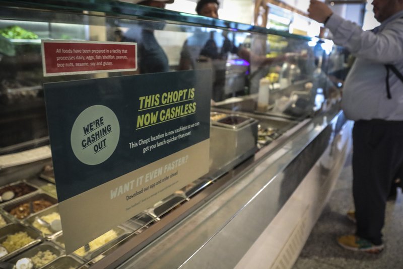 A restaurant sign alerts customers that it's "now cashless," Thursday Jan. 23, 2020, in New York. Lawmakers in New York City were voting Thursday on a measure to require stores and restaurants to accept cash. Critics of the cash-free business model say it discriminates against people who don't have bank accounts or who prefer to use cash. (AP Photo/Bebeto Matthews)