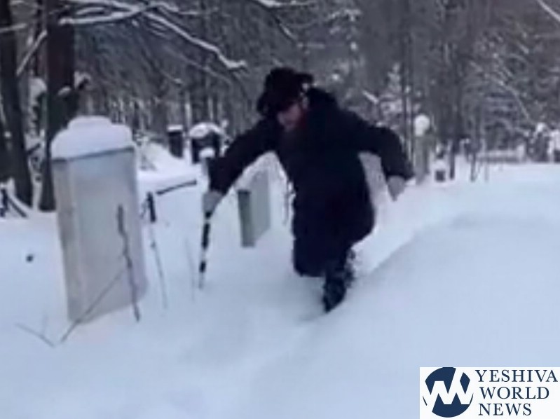The video shows Rabbi Dani Krichevsky, as he trudges over piles of snow in the cemetery.