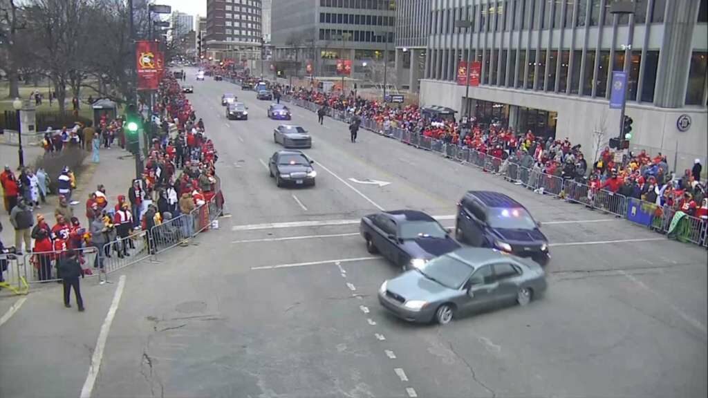 A vehicle broke through the parade barrier on the north side of the route at 8:12 a.m. All officers on the route were immediately alerted. Clay County Sheriff’s Deputies assisting KCPD deployed Stop Sticks, which the vehicle struck. The vehicle proceeded south down the route to where it turned at Pershing and was headed for the crowd.